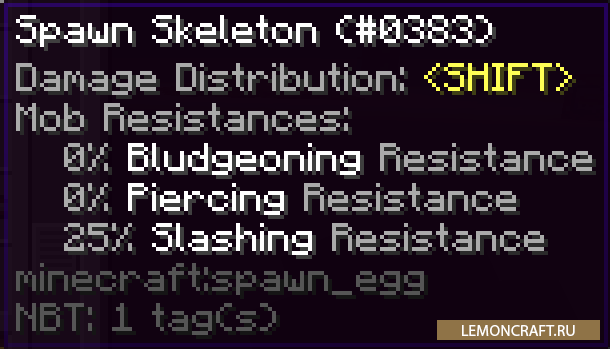 Мод на новую боевую систему Distinct Damage Descriptions добавляет в игру новую систему которая даст каждому предмету свою степень наносимого урона: дробящий, рубящий и колющий. При этом у каждого моба появится естественная защита на каждый вид наносимого урона. Соответственно мобы тоже будут использовать данную систему, атакуя вас в совершенно новом стиле.